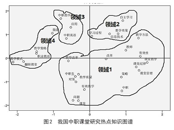利用SPSS20.0的系统聚类和多维尺度分析功能可以得到我国中职课堂的研究热点树状图(图1)与热点知识图谱(图2)。根据聚类树状图可以得出,我国中职课堂研究可以分为4类。种类1为中职课堂教学研究;种类2为信息技术环境下学生自主学习能力研究;种类3为中职英语教学的应用研究;种类4为中职翻转课堂教学模式研究。